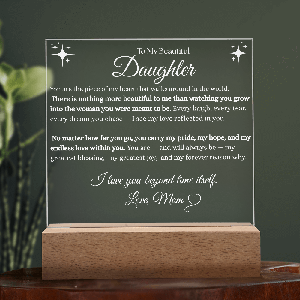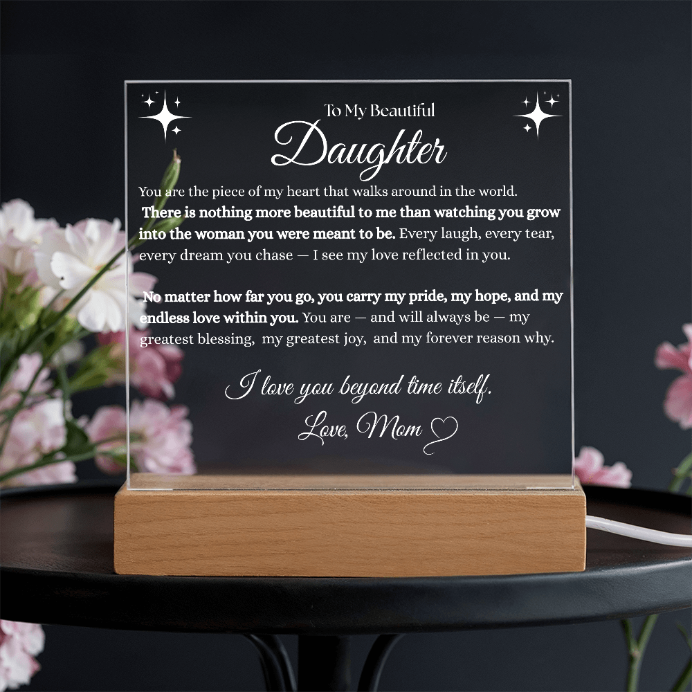 Your plaque will be crafted from premium acrylic with a professionally printed design for a polished look. It comes with a stylish wooden LED base, and you can choose between a USB plug-in option OR a cordless battery-operated option (requires 2 AAA batteries, not included). Both LED bases feature 7 vibrant colors, allowing the user to customize the lighting with various color changes and dynamic cycles.